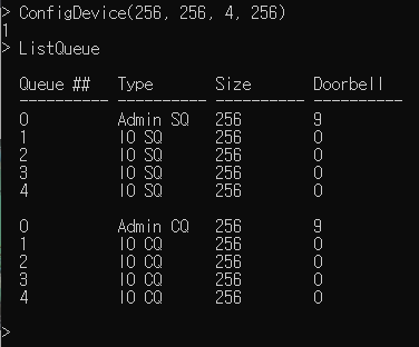 ConfigDevice(asqsize, acqsize, iocount, ioqsize)